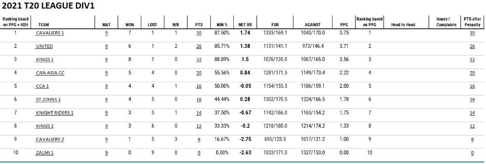 2021 T20 Div1 Standing based on C&DCL Operating rules